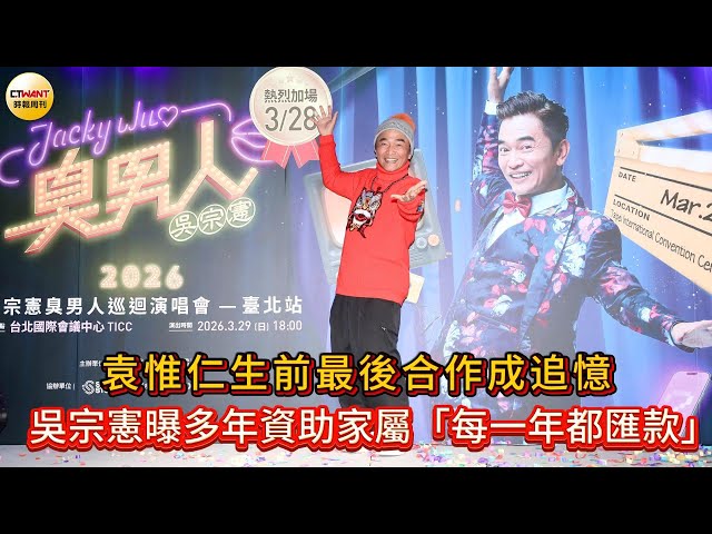 [周刊王CTWANT] 綜藝天王吳宗憲3月29日將在台北國際會議中心(TICC)舉行《吳宗憲JACKY WU〈2026臭男人巡迴演唱會〉台北站》,今(4日)演唱會記者會上,吳宗憲也談及日前病逝的音樂人「小胖老師」袁惟仁,他透露袁惟仁中風後,自己演藝圈內多位好友包括黃韻玲、游鴻明、莫凡、張宇、巫啟賢等人,都在同一個群組中彼此聯繫、分工協助照顧家屬。