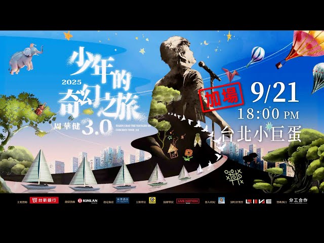「國民歌王」周華健睽違3年全新啟動《 周華健 少年的奇幻之旅3.0巡迴演唱會》繼北高雙蛋同步售罄後,宣布將於9月21日在台北小巨蛋加演,出道以來一直被稱為「忘詞王」,這回發豪語笑說:「你們的點歌單我都準備好背起來了!到時就是你們的伴唱機,保證不跳字!」