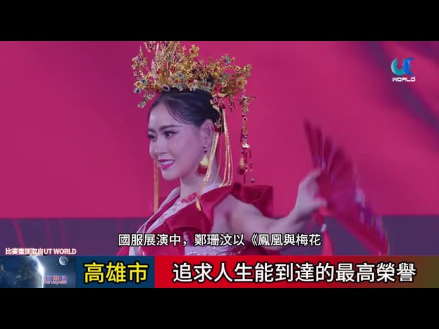 在國服展演中,鄭珊汶以《鳳凰與梅花:東方之光》為主題,透過改良式旗袍與鳳冠呈現台灣文化美學。鳳凰象徵重生、牡丹寓意榮耀,而台灣國花梅花代表堅韌不屈,整套服裝融入東方古典線條與現代時尚,舞台燈光照射下氣勢磅礡,引來現場熱烈掌聲。