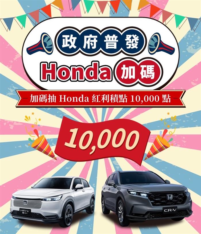 ◆ 活動內容:凡符合上述條件者,即可參加「政府普發,Honda加碼」紅利抽獎活動,將有機會獲得 Honda紅利積點10,000點。