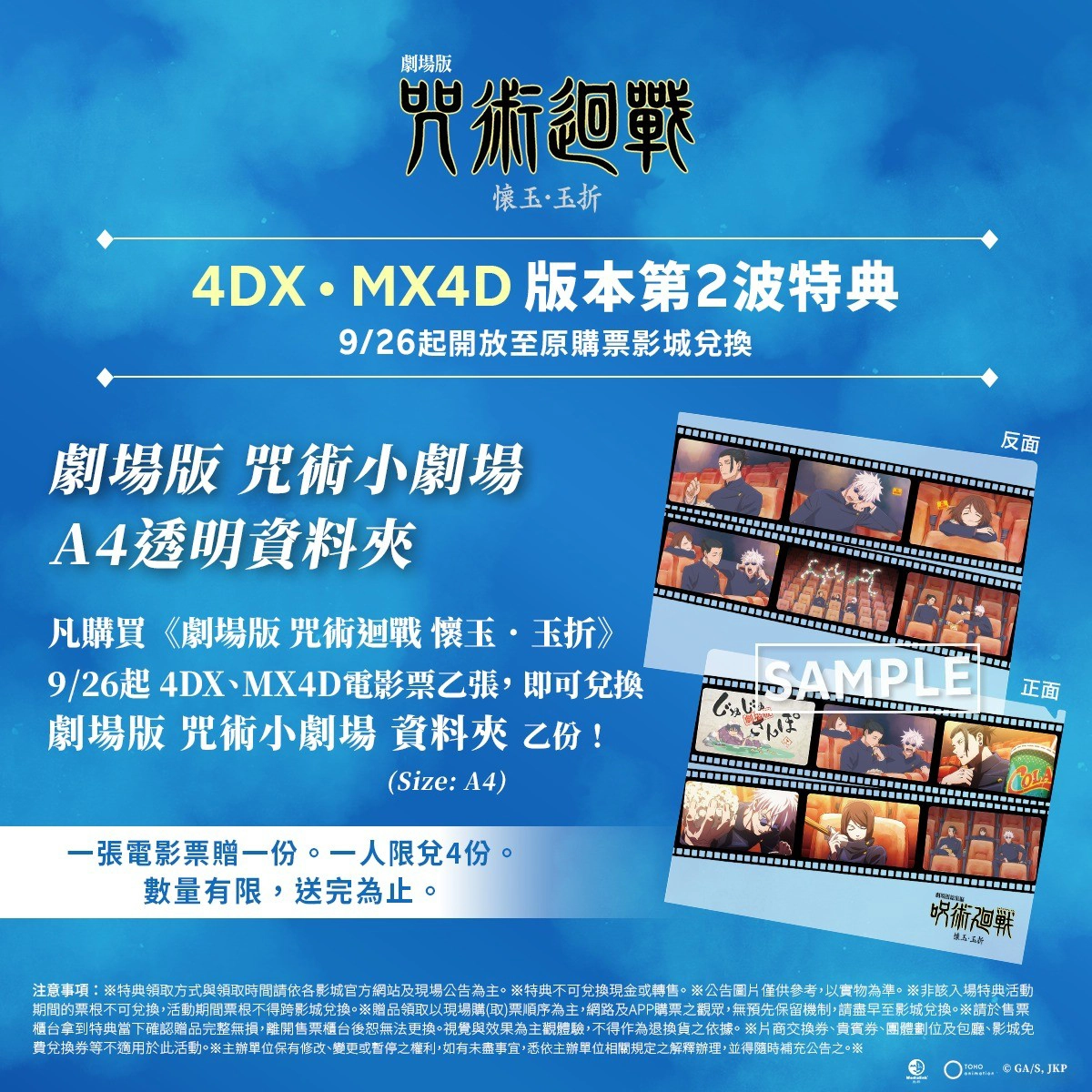凡購買《劇場版 咒術迴戰 懷玉.玉折》9/26 起「4DX 版本」、「MX4D 版本」電影票乙張,即可至原購票影城兌換「劇場版 咒術小劇場 A4 透明資料夾」乙份數量有限,送完為止。