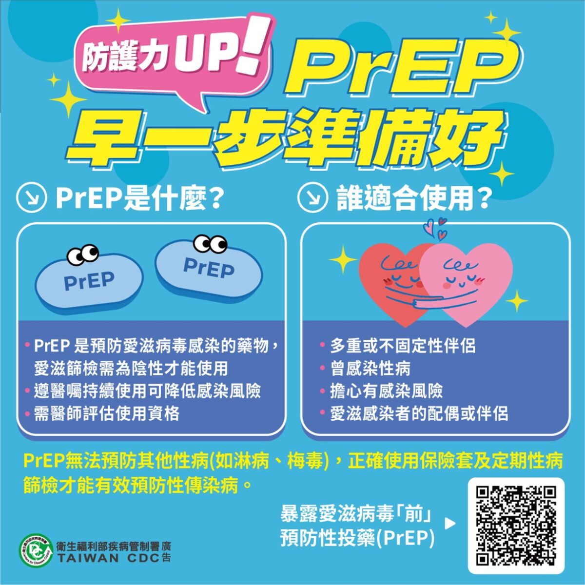 為了預防愛滋病毒感染,疾管署持續推動公費PrEP計畫,讓有感染愛滋風險的民眾,透過服用PrEP藥物,使體內有足夠的藥物濃度來預防感染,保護效果可達90%以上。雖然PrEP能有效預防愛滋病毒感染,但非萬靈丹,使用PrEP無法預防其他性病(如梅毒、淋病等),仍需要採取其他預防措施(如:全程正確使用保險套及水性潤滑液)及定期篩檢,多管齊下才能最有效的預防感染愛滋及其他性傳染病。