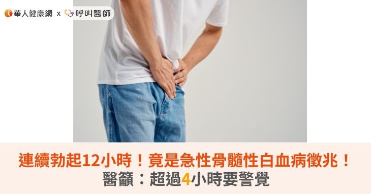 連續異常勃起超過4小時且無法自行緩解,小心可能也是急性骨髓性白血病徵兆!1名20多歲的男性服務業工作者,因清晨起床後發現陰莖異常勃起,沒有性刺激也無法消退,整體硬度明顯且伴隨疼痛感,直到傍晚仍未緩解,勃起持續超過12個小時後決定至診所就診。