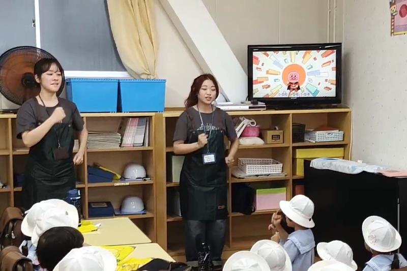 2位同學在出發前就做足準備,著手設計課程,先撰寫包含台日都通用的手指謠、日本童謠視唱、教具設計與應用等教案。到了日本實幼稚園後,又依園長囑咐自選幾冊日本或外國重要繪本,在熟讀過後以在台灣接受師資培育課程的經驗,對該園幼兒進行繪本導讀教學。