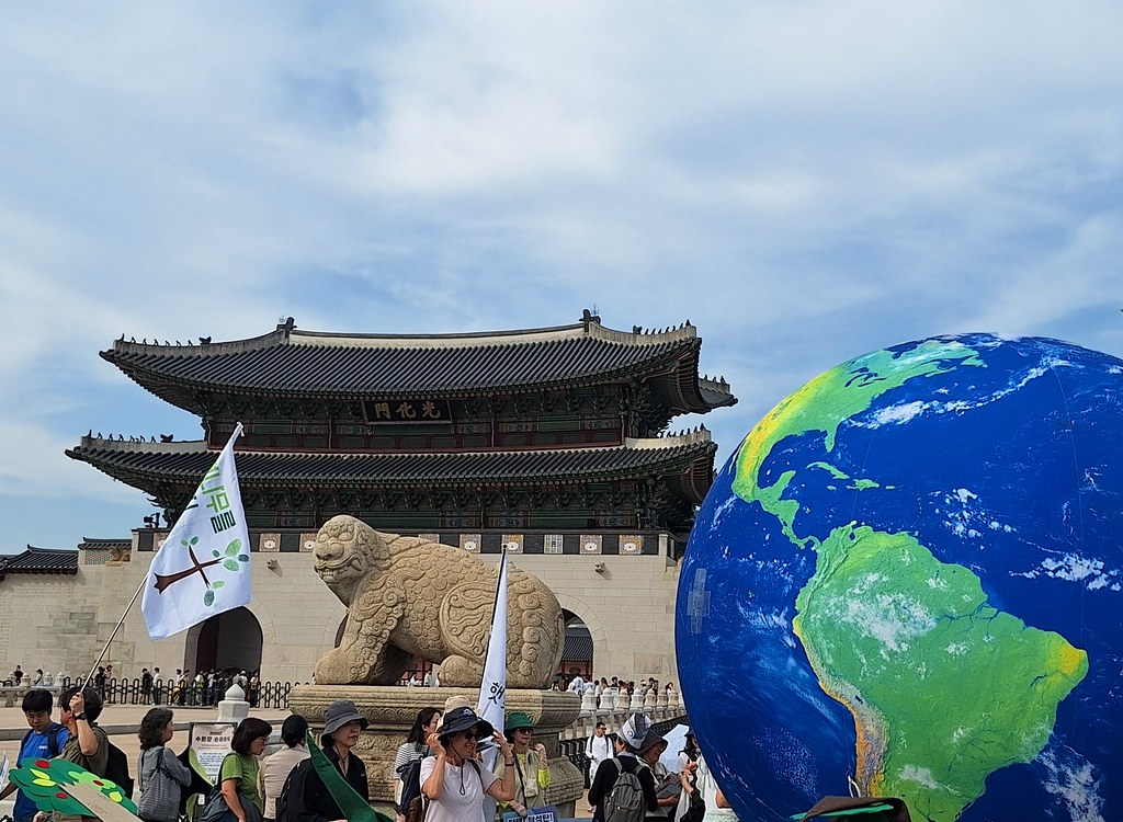 9月27日下午,首爾的光化門前旗海飄揚,有的抗議勞工權益受損,有的倡議守護生物多樣性,有的訴求政府立下明確的減碳目標,也有人爭取居住正義。慷慨激昂的演說間,傳來南韓國社運神曲──少女時代「Into The New World」,這是首爾今年度的氣候正義遊行。