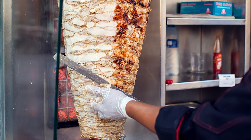 早期的烤肉很可能以整隻動物或動物的整個部位為特色。但幾個世紀前,奧斯曼帝國的廚師們發展出了一種不同的、更專業的技術,將生肉薄片層層疊加地放在烤肉叉上,形成一個緻密的錐形烤肉堆,可以在旋轉的同時進行烤製。