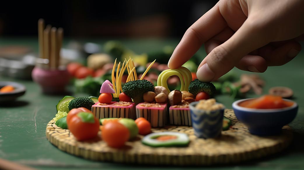 一撮完美捲曲的意大利麵懸掛在叉子上,彷彿正要入口。旁邊,一碗拉麵和一份炸豬排飯,雞蛋和炸豬排都熱騰騰地從鍋裡端出來。盤子裡堆滿了色彩繽紛的生魚片和精美的甜點。這真是視覺饗宴,但僅僅是視覺上的享受而已。