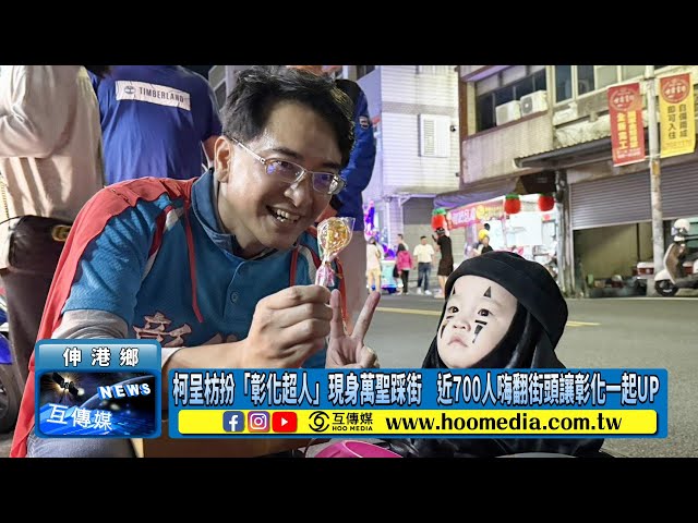 ▲萬聖伸港樂遊行,柯呈枋化身「彰化棒球超人」登場,與民眾開心合照、互動不斷。(記者林明佑翻攝)