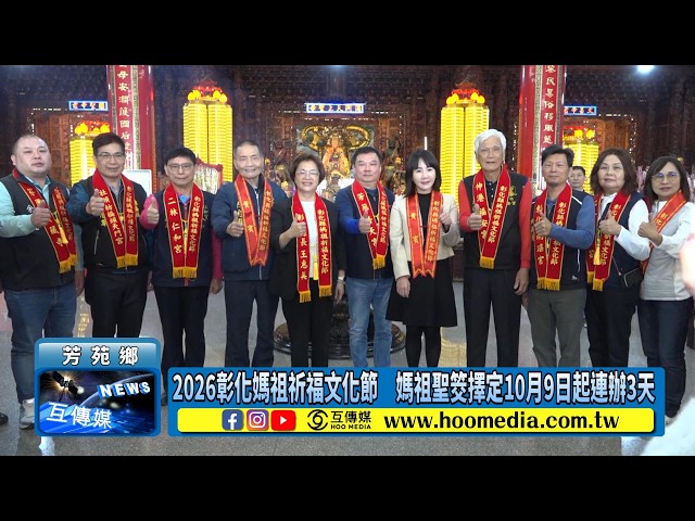 【互傳媒/記者 林明佑/彰化 報導】「2026彰化縣媽祖祈福文化節-擲筊求好日」活動,今(12)日上午在爐主宮廟芳苑普天宮盛大舉行,由彰化縣長王惠美擲筊請示今年彰化縣媽祖祈福文化節辦理吉日,在芳苑普天宮主委徐明戰、芳苑鄉長林保玲,與來自員林福寧宮、二林仁和宮、王功福海宮、鹿港台灣護聖宮、伸港福安宮、彰化南瑤宮、芬園寶藏寺、社頭枋橋頭天門宮、田中乾德宮、北斗奠安宮、埤頭合興宮、溪湖福安宮等共13間媽祖宮廟主委與各界嘉賓的共同見證下,擲筊請示媽祖。王惠美表示,擲筊結果由媽祖賜予2聖杯,正式擇定國曆10月9日至11日(農曆8月29日至9月2日)連續3日舉辦「2026彰化縣媽祖祈福文化節」,屆時13間宮廟媽祖神尊將集結於爐主宮廟芳苑普天宮,供信眾參拜,讓民眾一次就可獲得13尊媽祖的神力加持和庇佑。