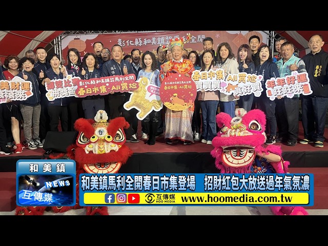 【互傳媒/記者 林明佑/彰化 報導】迎接2026金馬年到來,彰化縣和美鎮公所自2月13日至15日一連三天,在和美鎮鹿和路圓環停車場隆重舉辦「2026馬利全開—春日市集‧All買尬」活動,今日開幕首日便吸引眾多鄉親前來共襄盛舉,現場由氣勢磅礡的開運金獅演出揭開序幕,宣告這場為期三天的春日盛會正式啟動。和美鎮長林庚壬打扮成「財神爺」現場發放限量「一元復始」招財紅包外,活動也邀請歌手吳美琳現身熱情獻唱,讓會場洋溢著濃厚且喜慶的春節氣息。