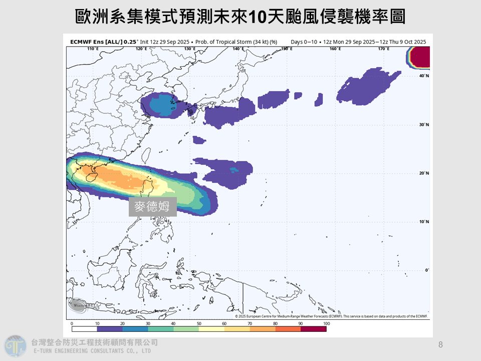 他強調,93W的動向值得持續關注,若在周四或周五增強為颱風,將是今年第21號颱風「麥德姆」。依照國際颱風命名規則,名稱由美國提供,「Matmo」在關島查莫洛語中意為「大雨」。