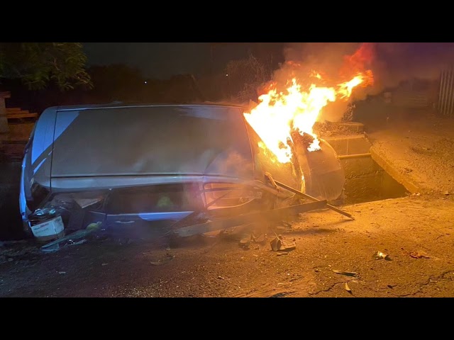 圖/台南昨(13)日晚間發生一起火燒車意外,一輛休旅車不明原因自撞,車身卡進排水溝後隨即起火。(翻攝 記者爆料網 YouTube)