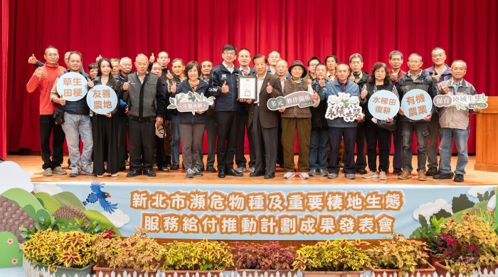 【民眾新聞葉柏成新北報導】新北市農業局今〈20〉日舉辦「114年新北市瀕危物種及重要棲地生態服務給付推動計畫」成果展,展現5年間將水田、水梯田營造為動植物共榮共存棲地的推動成果,農業局長諶錫輝頒發感謝狀予協助計畫推動的5位資深農友,現場邀請110位合作農友、農業部林業及自然保育署及各區農會交流分享經驗,期望可以將計畫推動至更多田區,守護新北市獨特的生態保育棲地。