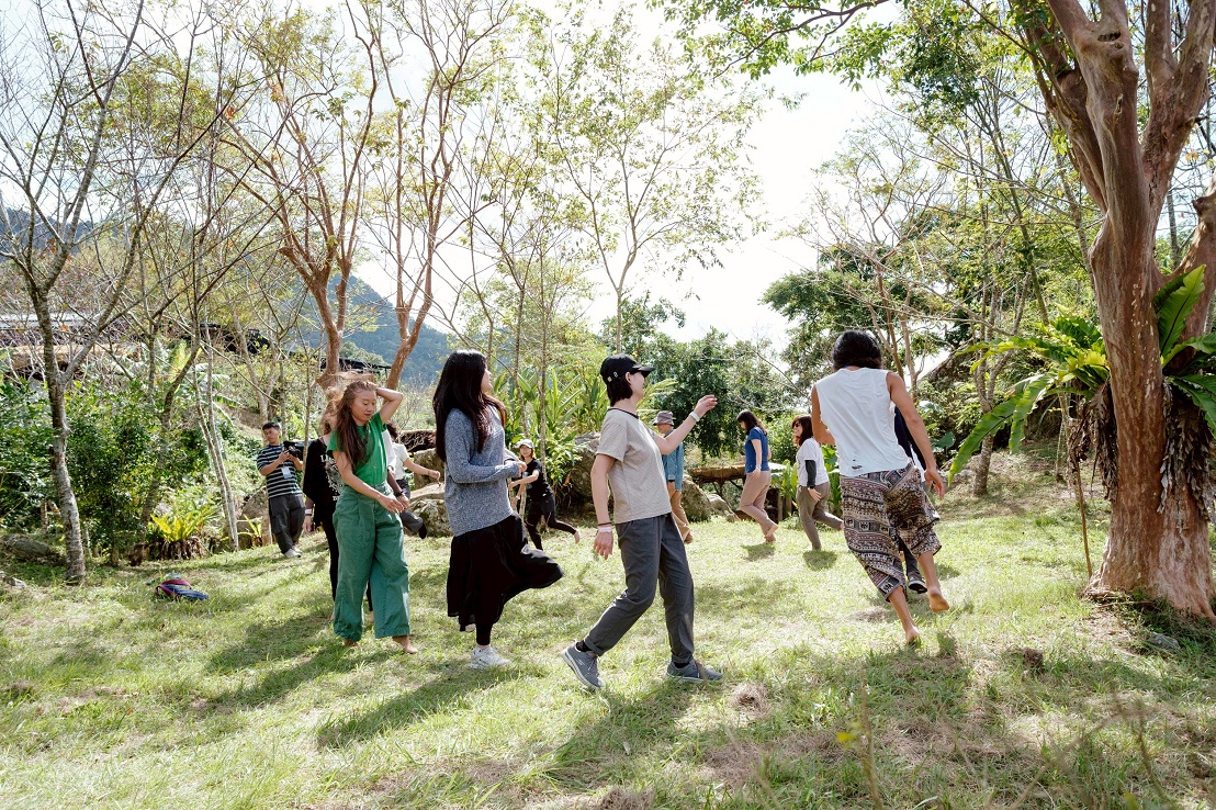 兩天的活動由鸞山森林文化博物館館長阿力曼老師親自導覽,帶領參與者走入盤根錯節、被譽為「會走路的樹」的千年白榕廊道,綠色穹頂在光影變化下宛如森林大教堂。「古老的智慧·森心靈療癒」課程中,阿力曼分享布農族與山林共生的哲學,提醒大家森林不是背景,而是我們共同生活的家園;接續的「生態身/遇見心林」由林奕其與謝湘蓁老師帶領,透過靜心舞動與自然藝術創作,引導參與者與土地產生新的連結。