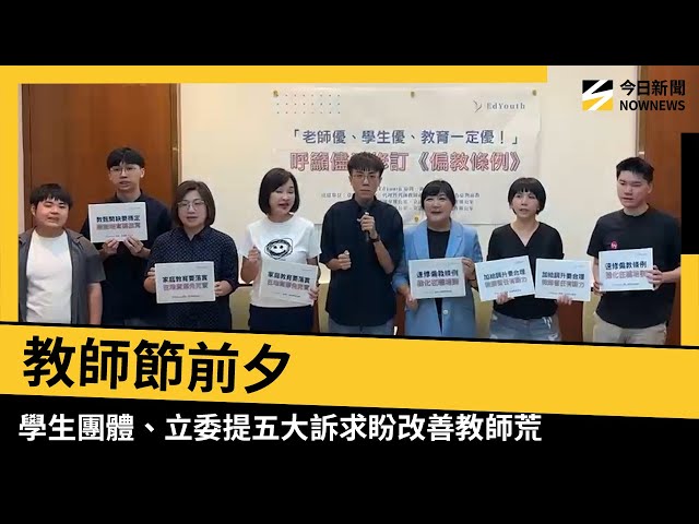 [NOWnews今日新聞] 教師節前夕,EdYouth一滴優教育協會、代理暨代課教師產業工會TFT為台灣而教,及跨黨派立法委員齊聚呼籲正視「教師荒」問題,包含改善濫訴、儘速修訂《偏教條例》、加強家庭教育、協助偏鄉無證代理老師取得教師證等。