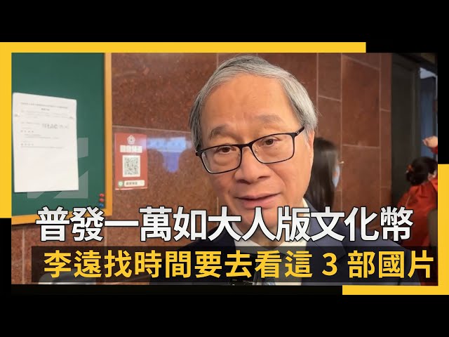 文化部針對年提供文化幣,13至15歲有600點、16至22歲有1,200點,可以用在藝文體驗及消費。李遠表示,普發現金一萬元可以想像成「大人版的文化幣」,自己拿到之後會全部投入在看電影、買書等,鼓勵民眾把這次的普發現金用在文化欣賞、體驗。