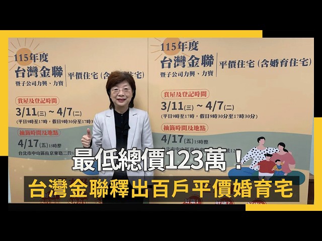 [NOWnews今日新聞] 為響應政府照顧婚育族群政策,慶祝台灣金聯資產管理公司成立25週年,台灣金聯今(10)日宣布,今(115)年再釋出100戶平價宅,以略低於市價約92折的固定價格,供民眾登記申購,其中首度推出「婚育住宅」共20戶,提供2年內登記結婚或育有0-6歲學齡前幼兒(含胎兒)民眾申購,今年也新增1人限登記1戶,且僅供自住,不作出租使用規定,最低總價是位在台東知本溫泉區的養生套房,售價123萬元,並自明日起開放登記至4月7日止,4月17日進行抽籤。