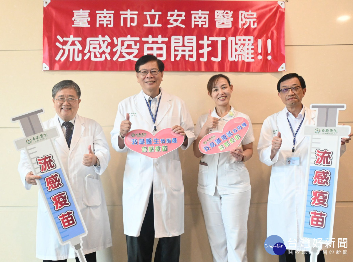 台南市立安南醫院1日流感疫苗開打,院長林聖哲與院內多位主管率先接種,並鼓勵同仁和民眾及早施打,以降低感染流感與新冠等呼吸道疾病的風險。