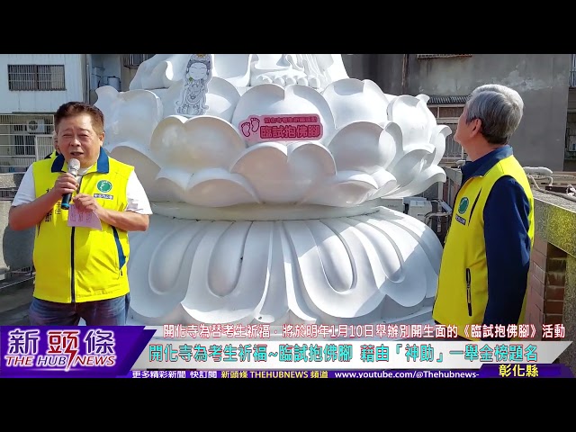 鑑於國內各項重要考試又將接踵而來,彰化市已有300多年歷史的開化寺,為了替考生祈福,將於明年1月10日舉辦別開生面的《臨試抱佛腳》活動,內容包括:祈福團拜、心經書寫、靈印加持等,藉由觀世音菩薩與文昌帝君加持穩定考生身心,且將開放寺內位於樓頂的一尊8公尺高大觀音聖像,讓考生登上樓頂,與觀音像合影並「抱佛腳」,期盼藉由「神助」,一舉金榜題名!