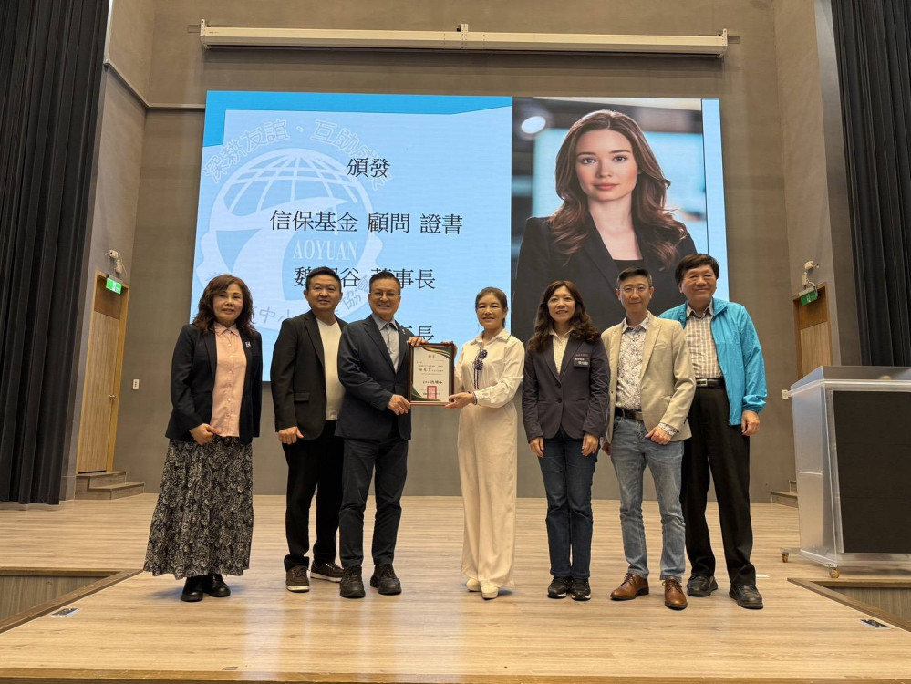 圖說:財圑法人信用保證基金董事長魏明谷(圖左三),特聘DTF科技集團創辦人蔡易潔博士(中)為信保顧問,AI司儀協助與會貴賓等合影。