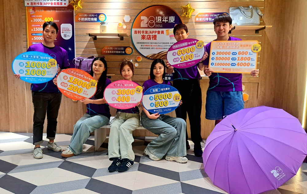 今年下半年新增3個國定假日,屏東太平洋百貨搶先回饋返鄉顧客,於中秋連假檔期即推出週年慶預購優惠,更以「天天滿仟送佰 週週卡友來店禮」為特點,提供顧客好康六重送,第一重~化妝品品牌推出一年一次消費即享9折起折扣;第二重~卡友/會員於化妝品當日單筆滿3000送400(電子商品券300元+抵用券100元)、本館(部份專櫃除外)當日累計滿5000送500;第三重~化妝品當日單筆滿15000元再加贈200元(每日每卡一次)、內睡衣當日單筆滿6000元加贈100元(可累贈);第四重~即日起~10/22(三)第一波加碼,全館(部份專櫃除外)當日累計滿3萬再加贈600元、滿5萬加贈1800元、滿10萬加贈4000元;第五重~高單價顧客整檔期再回饋,週年慶整檔期期間新增一門檻,滿28萬加贈象印快煮電氣壺(市價3700元)、滿38萬再加贈5000元、滿50萬再加贈10000元(擇一門檻兌換,每人可兌換乙份贈品);第六重~優雅粉紫色調系列卡友禮週週送,總回饋金額優於去年,各項專屬回饋,等您來歡慶。