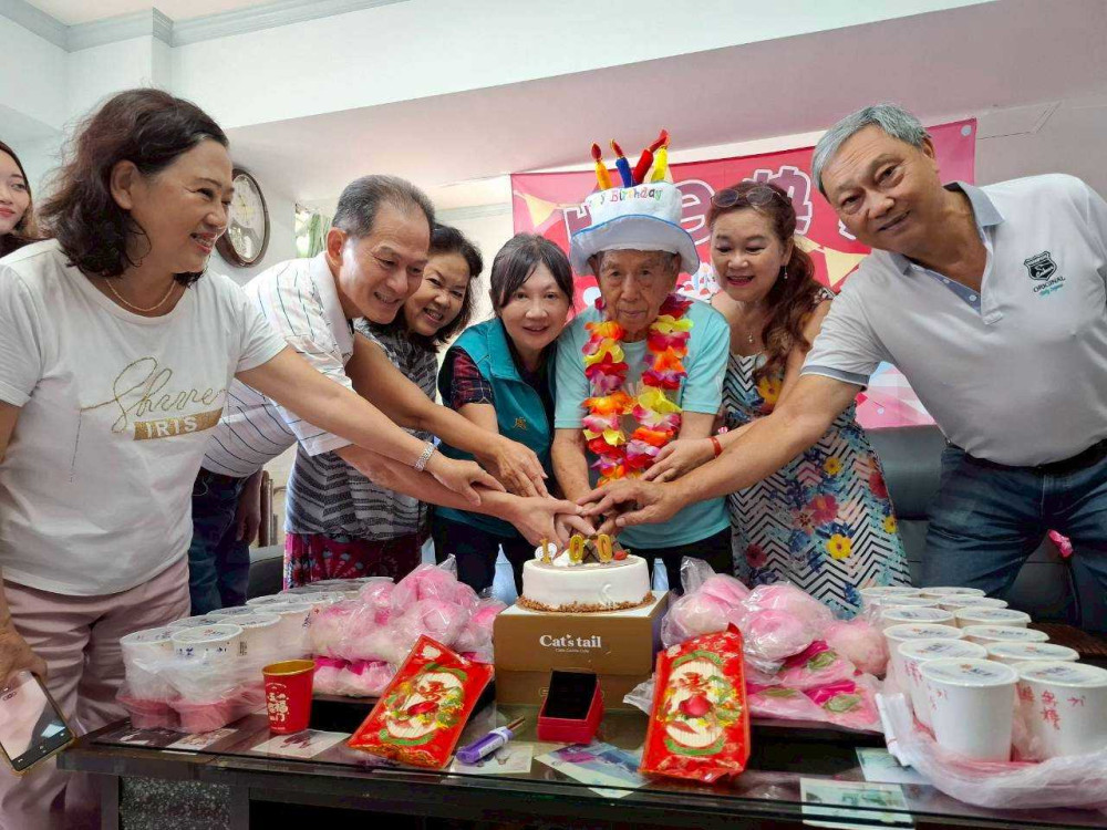 慶生過程中,榮欣志工隊長獻上花束祝福,在地陳里長送上壽桃慶賀並分享與伯伯一家緣分,兒女及孫女也特別送上祝福,薄伯伯還神采奕奕與薄家一家人共同歡唱〈甜蜜蜜〉與〈中華民國頌〉,聲音鏗鏘有力,過程溫馨歡樂,大夥也一同齊唱〈生日快樂歌〉,一同祝賀長輩身體康泰、福壽綿延,大家歡樂滿滿。