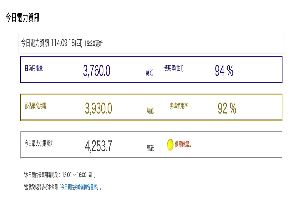 台電預估,今天全國尖峰用電量將衝上3930萬瓩。根據台電官網14時20分的最新數據,用電量已達3848.6萬瓩,用電率逼近94%,電網壓力相當沉重。
