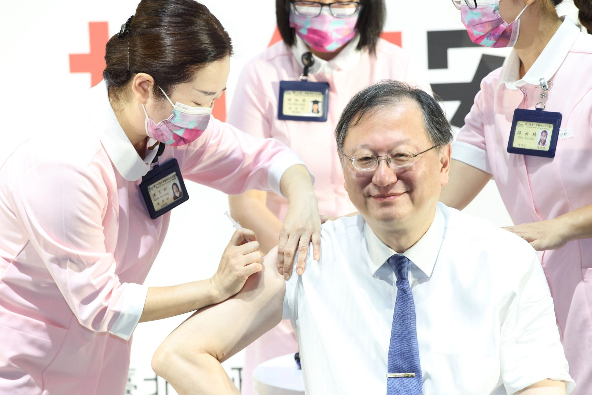 台大醫院院長余忠仁率先代表醫事人員,公開示範接種疫苗。(陳愷巨攝)