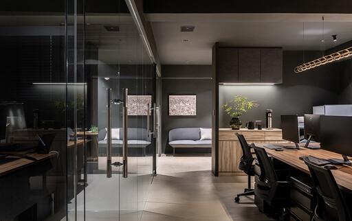 主管辦公室延續公共領域的暗色基底,描繪整體劃一的視覺風格,並以隔音良好的清玻立面劃分三處座位區,而各隔間交界處上方安裝的玄色調光簾,可依當下所需調整光線與遮蔽程度,確保設計師創作、思考時具有安靜獨立的個人角落;每一處細節皆回應實際使用需求,使整體辦公場域不僅是日常工作的場所,更成為激發創意、沉澱思緒的創作天地。