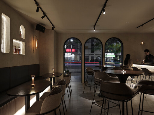 用餐區刻意壓低整體亮度,營造帶有私密感的沉靜用餐氛圍,透過壁龕內的間接照明,以柔和輔光鋪敘明暗有序的光影層次。座位配置上,部分採高腳桌椅拉近座位間距、提升動線彈性,讓顧客在久坐後能自然起身活動,維持用餐舒適度;位於牆側的沙發區則以其相對獨立性,圍塑輕鬆自在的交流環境,適合親友歡談、多人聚餐,展現空間對多元社交模式的細緻考量。