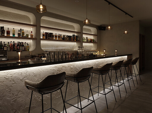 吧臺區相應對側用餐區牆面的挖鑿鏤空手法,結合展示與光束通透的雙重功能,將每方孔洞、壁龕精心排列,其間擺放風格各異的酒款,使瓶身在光源照射下,成為空間中的精美動態展品,而空間兩側如光牆般的流動端景,亦讓吧臺在備飲區機能外,化作醞釀柔雅氣氛的藝術裝置,讓品飲超越味覺感受,進一步轉成隨場域節奏流轉的沉心賞景之旅,並回應店內細膩的感知性與儀式性。