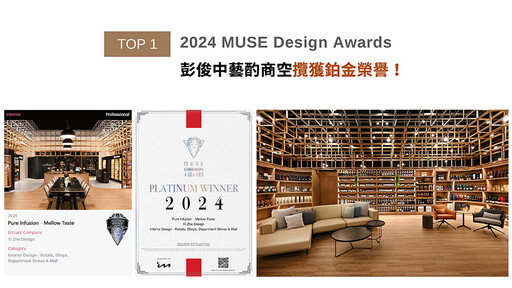 MUSE Design Awards以發掘全球設計繆思為宗旨,替建築、室內、時尚等領域提供全面的發光舞台。回應商家販售酒類的性質,彭俊中總監以玫瑰金、金、銀三色木製立方體,於挑高空間上方堆砌出漸層酒液托舉浮冰的意象,作品《釀粹 · 悠淳》觸動本屆評審心弦,圓滿迎來「鉑金獎」殊榮!