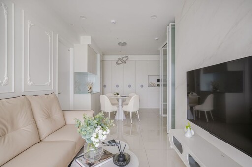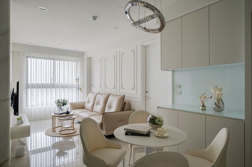 整體空間的風格定調,以業主想要的法式古典為導向,結合現代設計語彙,並選擇白色調搭配留白手法,在簡潔、俐落的空間感下,襯托出溫馨浪漫的氣息。此案為17坪的新成屋空間,為2房1廳的生活格局,設計團隊透過調整隔間的方式凸顯景觀宅的優勢,讓人在家裡悠閒泡咖啡的同時,從客廳就能一覽河岸風景。結合對空間尺度的掌握,在有限的坪數下傾注機能,擘劃貼近生活的理想動線,利用空間的點線面,搭配材質與色調,為居住場域體現充滿設計感的優雅小宅。
