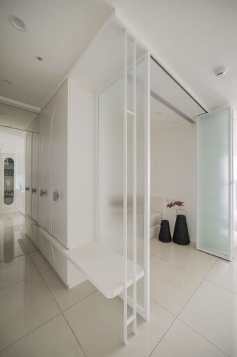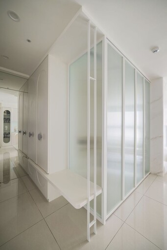 在私領域的部分,在主臥設計上將床頭牆結合櫃體設計,搭配線板元素、明亮採光,為起居環境營造優雅古典又清新迷人的氣息;特別打造多功能空間,提供閱讀、休憩機能,應用玻璃摺疊拉門,讓其可以因應不同使用需求給予開放與遮蔽的功能性。