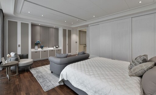 設計團隊重視空間細節,透過精挑細選材質的方式,在客廳的電視牆面、地板以大理石鋪陳,營造自然的奢華感,同時應用鐵件元素,結合裝飾吊燈、懸掛畫作的畫框等,增加空間的藝術感和現代氣息;臥室以木地板、床頭板等,營造出寧靜舒適的氛圍,並增加房間的品味與溫暖。透過特殊材質的運用,讓客廳、臥室呈現出獨特風格和高雅品味,提升豪宅的品質和氛圍。