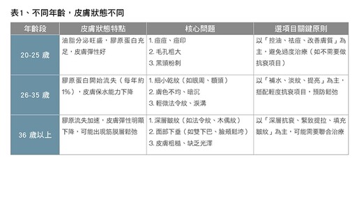 想選對醫美項目,首先要了解自己年齡段的核心皮膚問題,這是選擇項目的基礎。(表1)