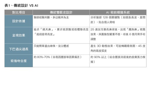 以前做雙眼皮,醫師大多靠「畫眼線」或「貼雙眼皮貼」來模擬效果,但這種方法不只不精確,也很難呈現長期術後的狀態。而AI模擬系統運用的是「臉部黃金比例演算法」,能結合你的骨相、眼型甚至眉骨高度來設計,差別真的很大!(表1)
