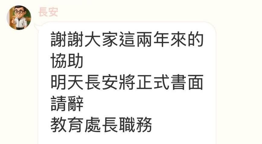 《CNEWS匯流新聞網》上週踢爆澎湖縣政府教育處處長林長安,與一名人妻代課老師L女(化名)過從甚密,L女的丈夫K男(化名)得知後,找來徵信社蒐證,果然連續在一周內拍到妻子頻繁出入林長安住處,2人互動有如情侶。事情曝光後的第一時間,澎湖縣長陳光復對避重就輕表示「林長安是位優秀的教育處長」,隻字不提是否將他職務調整,不過林長安於昨天在教育處的內部群組中貼文表示,他將在今天正式書面請辭處長一職,而陳光復今天上午也親口證實,已經接受林長安辭去教育處長職務。