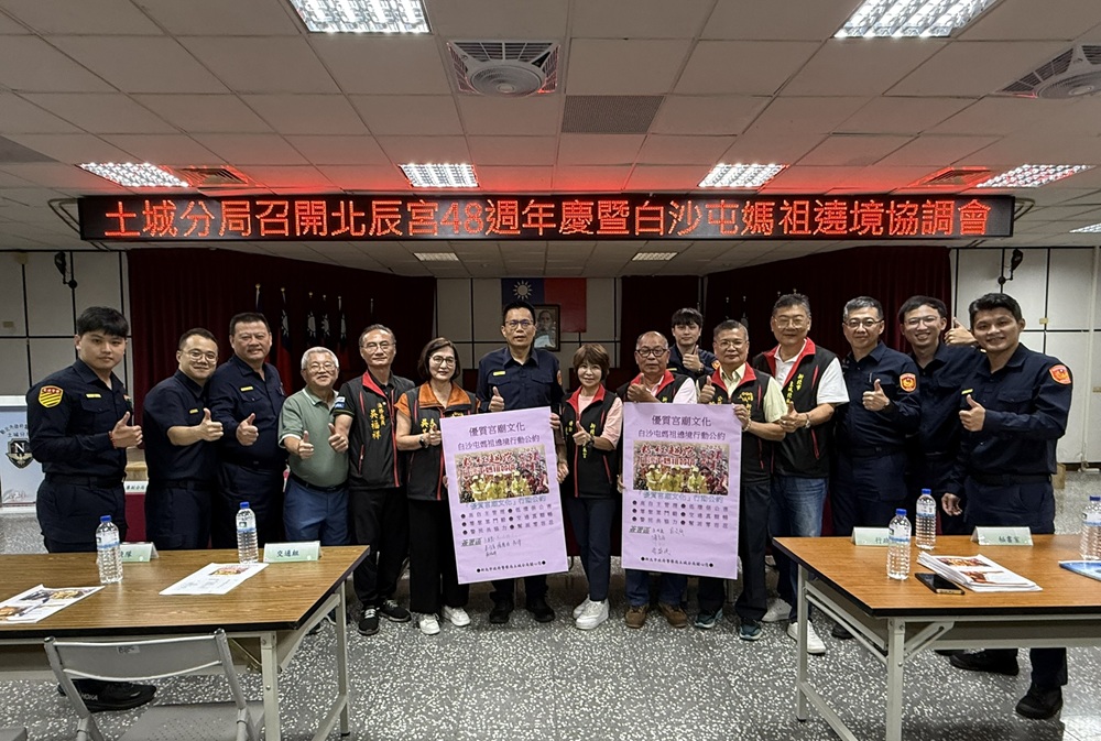 土城警分局表示,昨(22)日邀集土城區公所、各里里長、消防、清潔隊及宮廟等單位,共同召開協調會,提出「高自主管理、低環保公害、零聚眾鬥毆、交通真順暢、警民共協力、社會好期待」等6大行動原則,展現警方與民間單位攜手合作的高度共識,為遶境活動拉開精彩且安心的序幕。