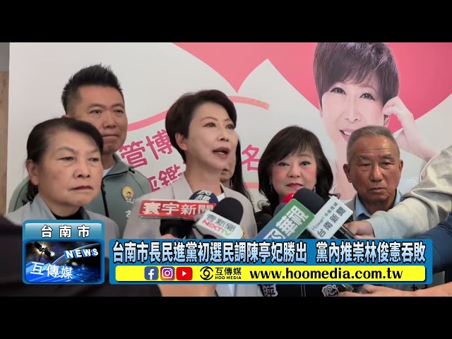民進黨公布台南市長初選民調,立法委員陳亭妃以60.8557%民調超越立委林俊憲58.1630%,陳亭妃臥薪嘗膽終於達成8年想選市長心願,而台南市是賴清德總統本命區,加上立委謝龍介甫獲國民黨徵召提名參選台南市長民調呈現低迷,若藍營未來沒有完善的參選策略,陳亭妃將有機會成為台南市首位女市長。