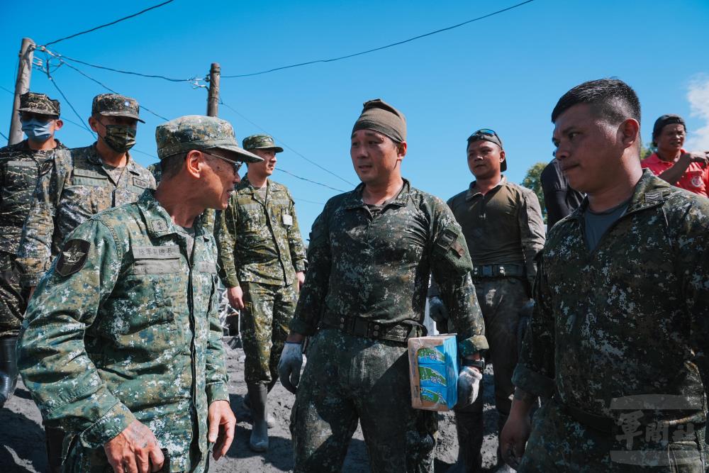 隨後,陳副總長前往慰問協助清除淤泥、搬運物資以及執行任務中的官兵,提醒他們在投入任務時務必注意安全,平安順利完成救災任務。