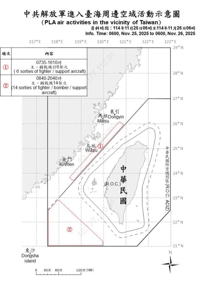 (軍聞社記者莊家豪臺北26日電)國防部今日表示,至上午6時止,偵獲共機20架次(逾越中線進入西南空域14架次)及共艦5艘,持續在臺海周邊活動。國防部強調,國軍運用任務機、艦及岸置飛彈系統嚴密監控與應處。