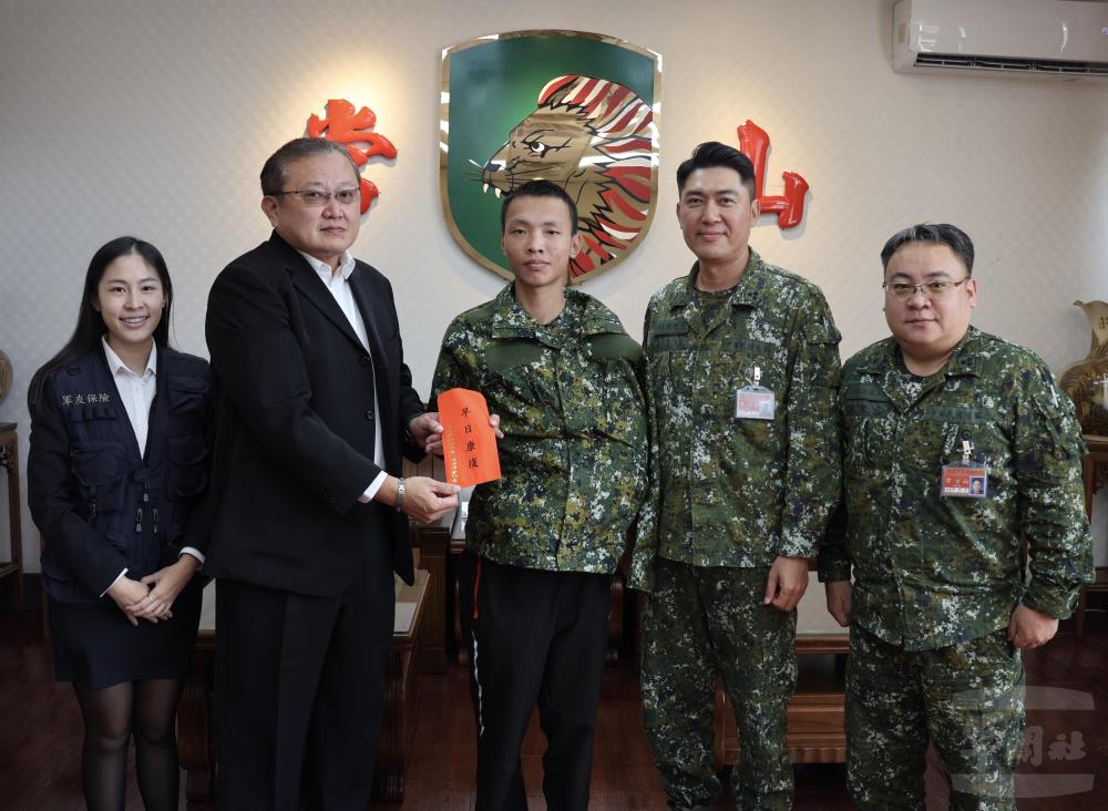 (軍聞社記者蔡枋澐臺北29日電)陸軍步兵第104旅王姓士兵日前進行手榴彈投擲操課訓練時,因姿勢失當不幸致肱骨骨折,軍友保險公司董事長郭建忠在獲悉此情後,特別指派臺中處處長徐志偉前往營區探視慰問王姓士兵。
