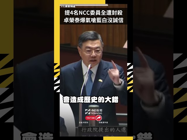[NOWnews今日新聞] 立法院今(7)日行使NCC委員同意權,4名被提名人全遭封殺,行政院長卓榮泰今下午在總質詢時怒轟藍白沒誠信,行政院已遞出橄欖枝,甚至遞出半個橄欖園,藍白卻未同樣釋出善意。民眾黨立院黨團回嗆,卓榮泰公然在國會說謊,違法延宕NCC委員與中選會委員提名日程,如今竟還有臉暴怒甩鍋,簡直毫無下限!