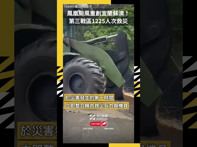 [NOWnews今日新聞] 鳳凰颱風夾帶驚人雨量重創宜蘭蘇澳及周邊地區,瞬間造成多處重大災情。第三作戰區今(13)日表示,於災害發生的第一時間,立即整合轄內救災兵力與機具,立即投入災害搶救與復原行動;昨日更持續自各駐地增派救災兵力與裝備,風雨無阻趕赴蘇澳地區,以實際行動展現國軍「與民同在」的承諾,讓民眾在最需要的時刻,第一眼就能看見國軍迷彩的身影。