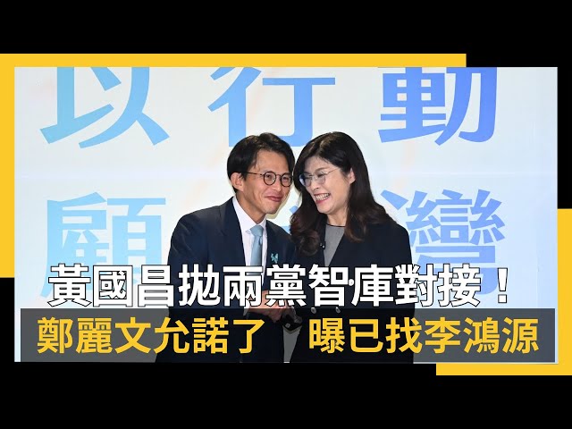 [NOWnews今日新聞] 國民黨主席鄭麗文、民眾黨主席黃國昌將在今(19)日下午3時會面。在對談環節中,黃國昌拋出要兩黨智庫對接,鄭麗文也回應,「未來平台可以結合台灣越多人越好」,也透露自己這兩天才剛跟前內政部長李鴻源討論這個話題,希望他幫忙組成相關團隊,對於具體區域,甚至地方政府的政策或是建設,提出願景跟藍圖,有專業前輩也是讓台灣年輕人大展身手的平台。