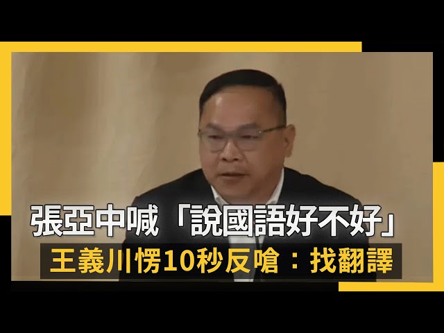 王義川代表民進黨發言,才剛講沒多久,對面的張亞中就喊話,「講國語好不好!」突如其來的一句,讓王義川當場愣住,呆了10秒。主席、立院副院長江啟臣說,請大家彼此尊重,王義川說,「主席,他什麼意思?」江啟臣請王義川繼續發言,王義川再接著講,並嗆,「我用什麼話講是我的權利,你如果聽不懂,去找翻譯啦!莫名其妙,囉嗦什麼意思!」