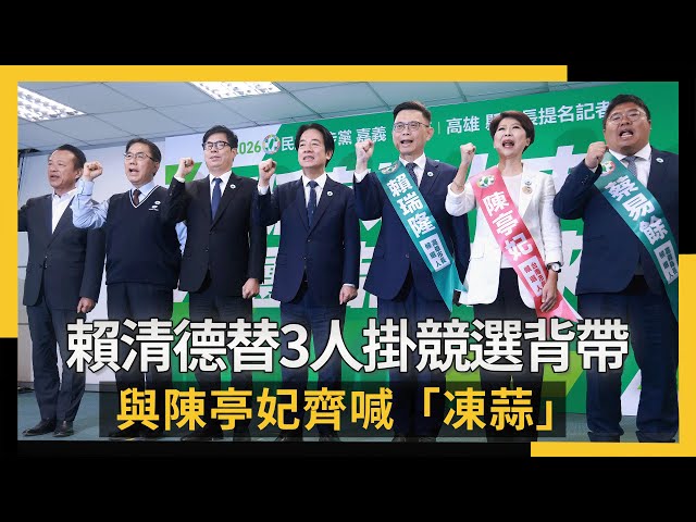 [NOWnews今日新聞] 民進黨高雄市長、台南市長、嘉義縣長初選落幕,中執會今(21)日正式通過提名,由身兼黨主席的總統賴清德為賴瑞隆、陳亭妃、蔡易餘三位參選人披掛競選背帶,眾人齊喊「凍蒜」口號。賴清德表示,民進黨提名三位縣市長候選人有共同特點,都是問政表現傑出、深耕基層、獲民眾肯定的立委;此外,在與陳亭妃互動上,賴清德除了替陳掛上競選背帶外,兩人也多次握手致意。