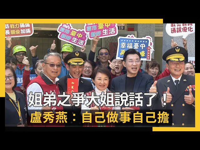 [NOWnews今日新聞] 下屆台中市長選舉,藍營姐弟之爭越演越烈,江啟臣和楊瓊瓔昨晚先後在臉書發文,再度引爆話題。江啟臣今天在選區谷關與市長盧秀燕合體,媒體追問有關初選一事,他原想推讓盧秀燕先受訪,豈料盧秀燕以姐姐的口吻望向他說「你自己做事自己擔啦」!江啟臣期待中央發揮智慧,趕快結束這種不確定。盧秀燕也難得在上班日發表看法,希望「越快越好、事不宜遲」。