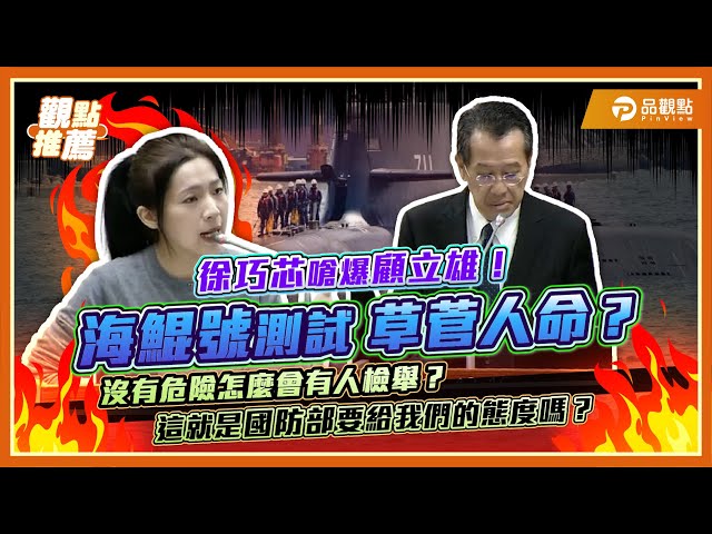 立委徐巧芯昨(1)日在立法院外交國防委員會針對海鯤號潛艦海測爭議進行質詢,直指海鯤號在錨機損壞的情況下仍執行海上測試,質疑這是「政治性海測」,將造價256億元的首艘原型艦安全當兒戲。